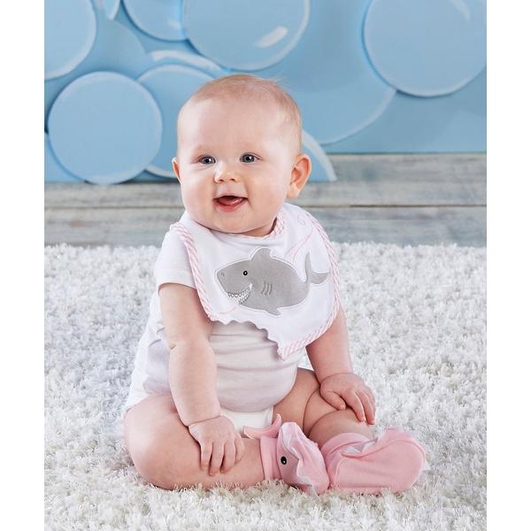コロンとしたサメのモチーフがかわいいビブとブーティーのセット。